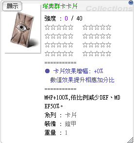 當塔奧群卡卡片為1星時,MHP會變成 100 + (100 * 1 / 100) = 101% ,但同時減少的DEF / MDEF也會增加。