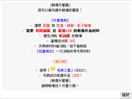 【裝備升星】所需要的材料是:「精煉度達+10」的相同編號裝備
