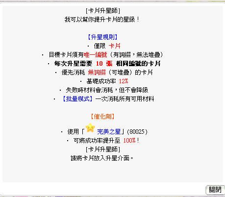 【卡片升星】需要材料:『相同編號』的卡片 「10張」 ,【王卡】則為相同編號的王卡「1張」